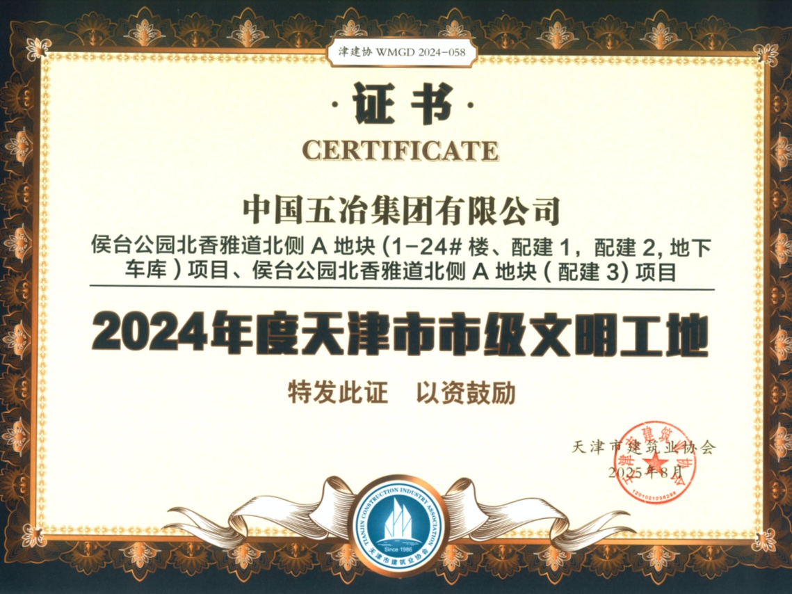 近日,中国五冶集团华北公司承建的天津绿城水西云庐项目、天津中新生态城动漫园小学项目、天津外国语大学附属静海外国语学校项目分别荣获"2024年度天津市市级文明工地"称号。